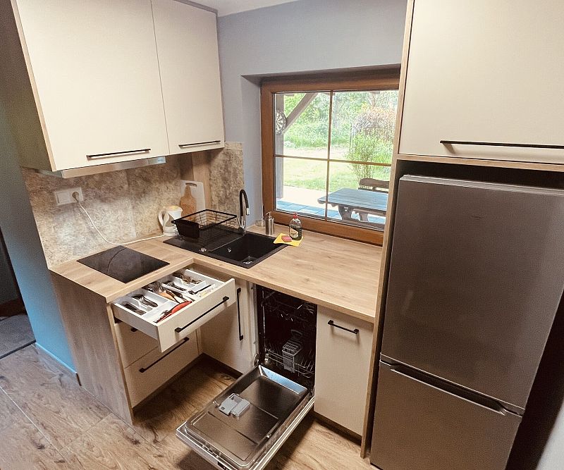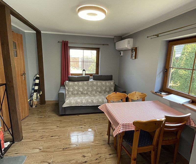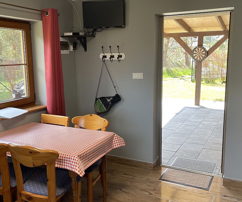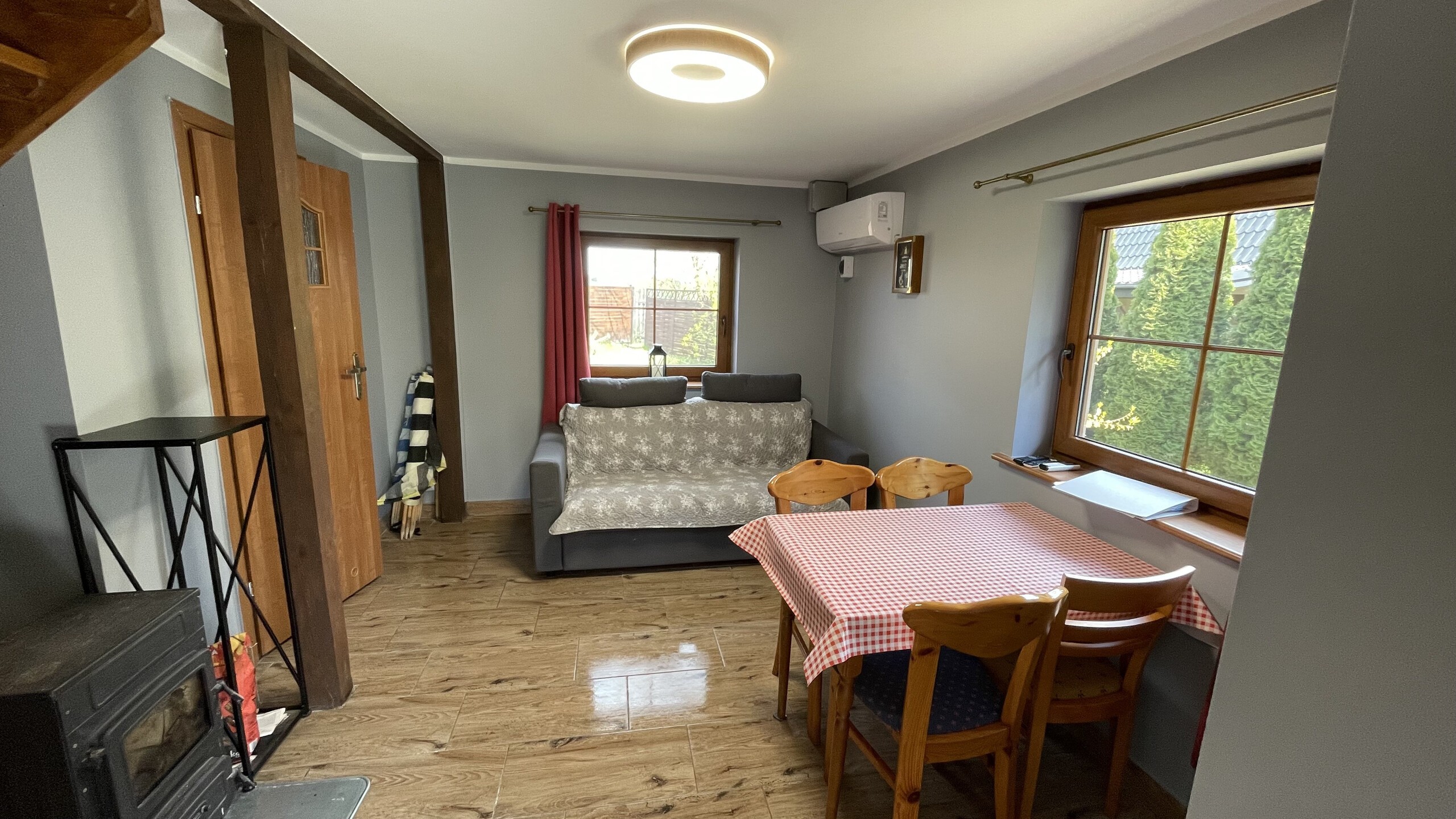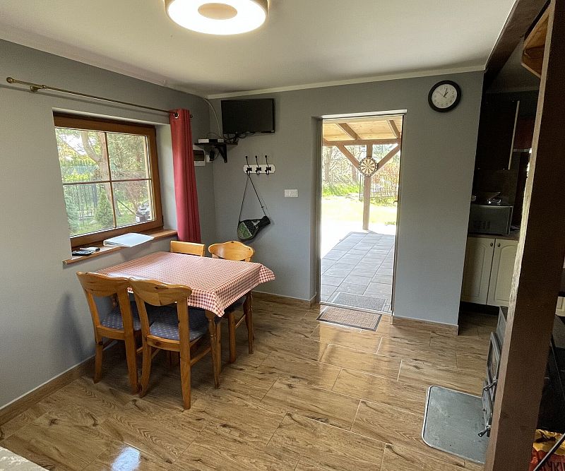 W cenie tego domku jest pokój z łóżkiem małżeńskim, drugi pokój z dwoma łózkami pojedynczymi. Na dole salon, TV, kominek, łazienka, rozkładana kanapa dwuosobowa, kuchnia. Domek posiada duży taras, sprzęt do grillowania, otoczony jest zielonym ogrodem.