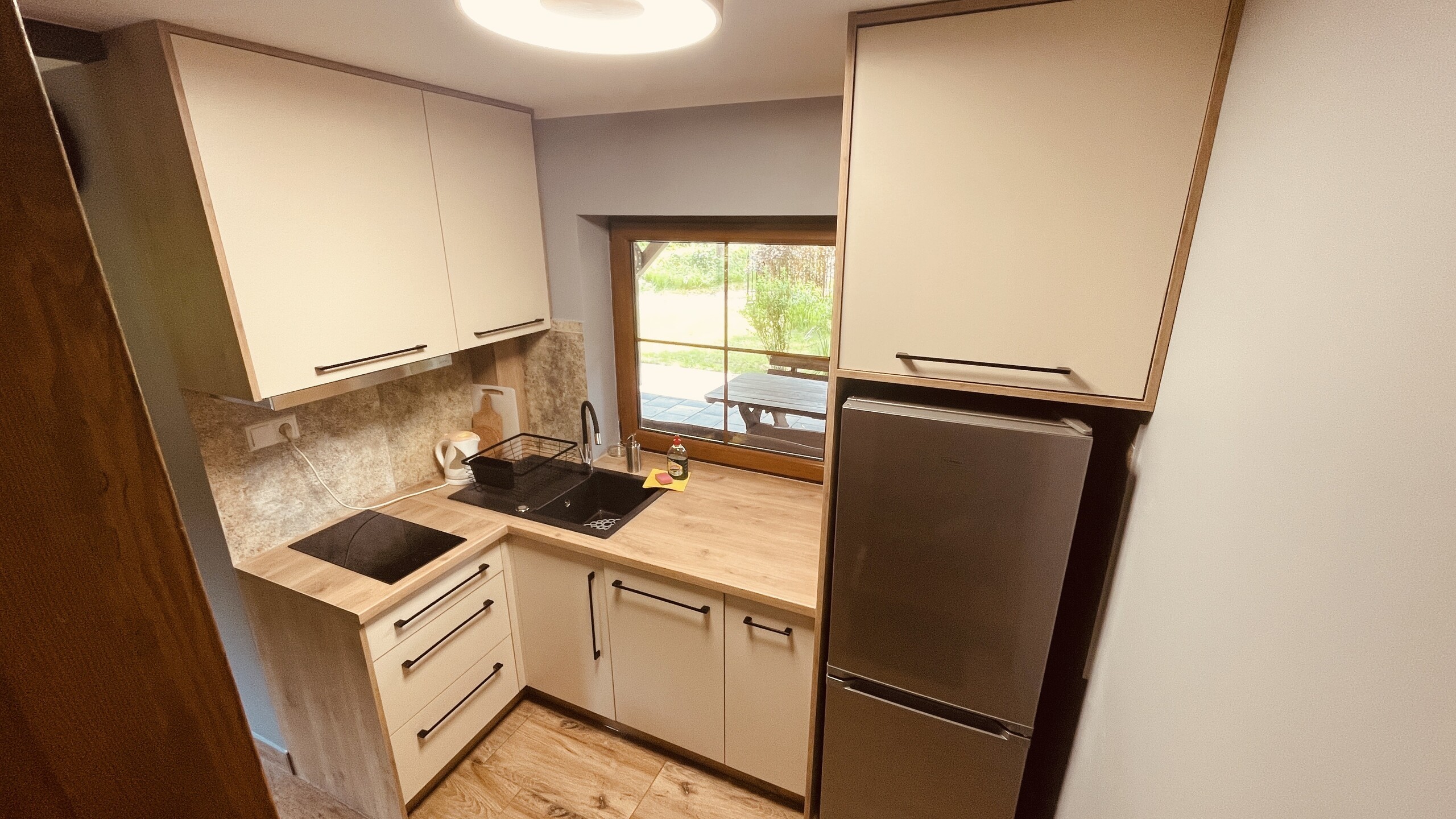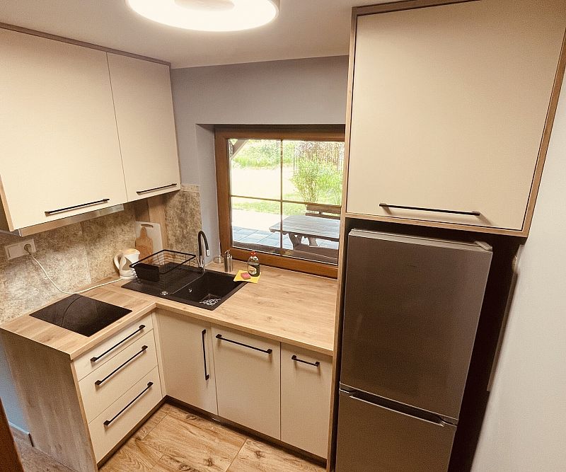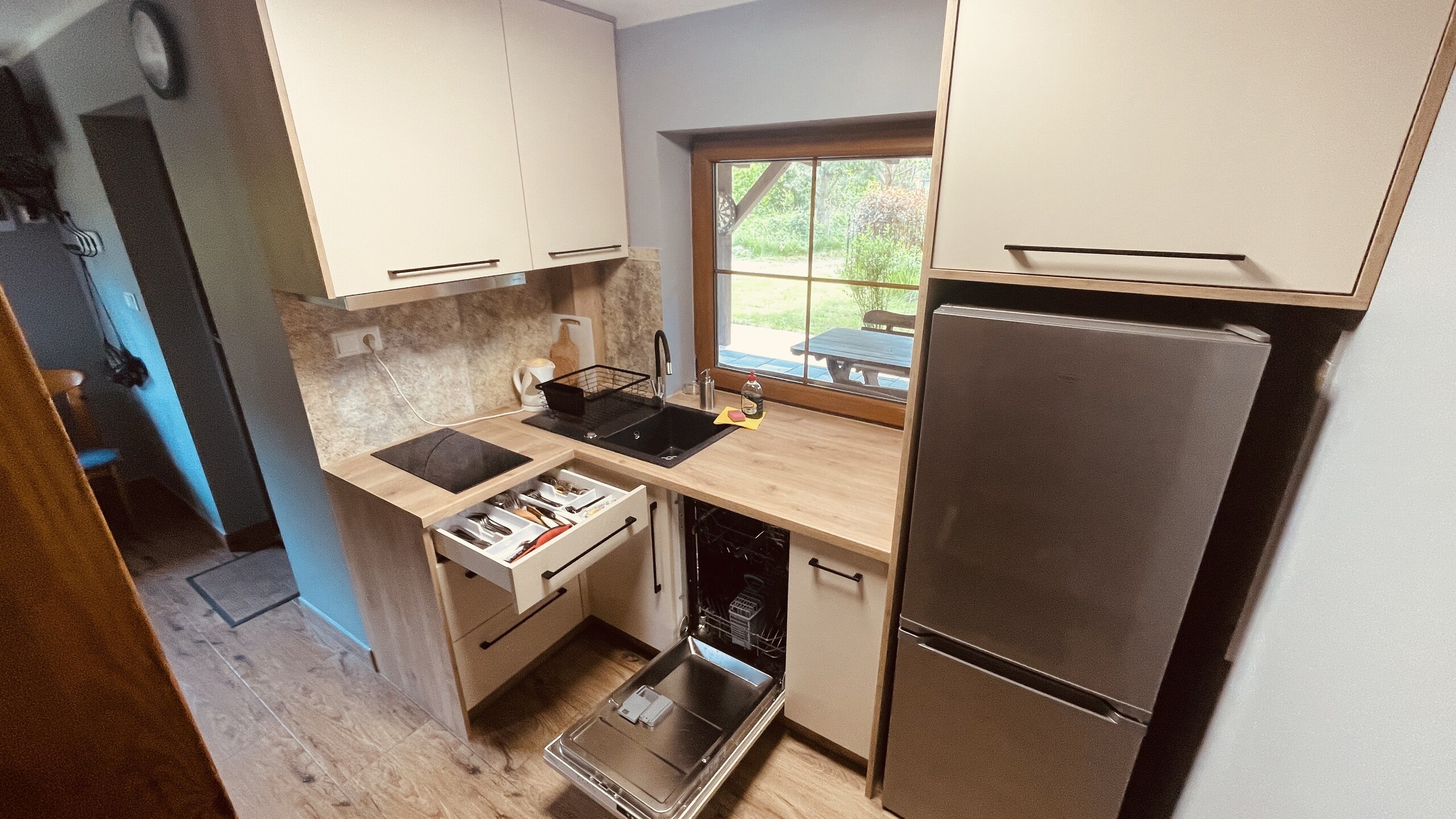 W cenie tego domku jest pokój z łóżkiem małżeńskim, drugi pokój z dwoma łózkami pojedynczymi. Na dole salon, TV, kominek, łazienka, rozkładana kanapa dwuosobowa, kuchnia. Domek posiada duży taras, sprzęt do grillowania, otoczony jest zielonym ogrodem.