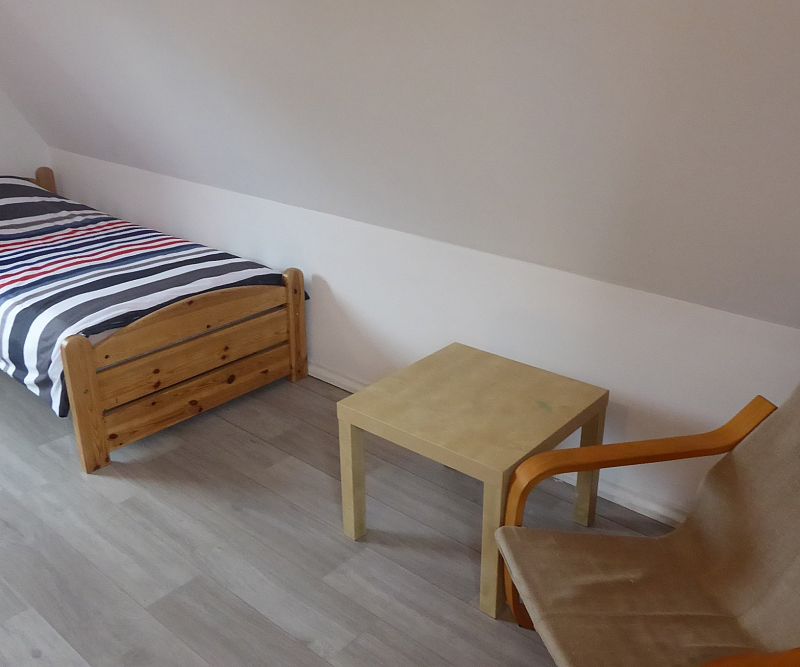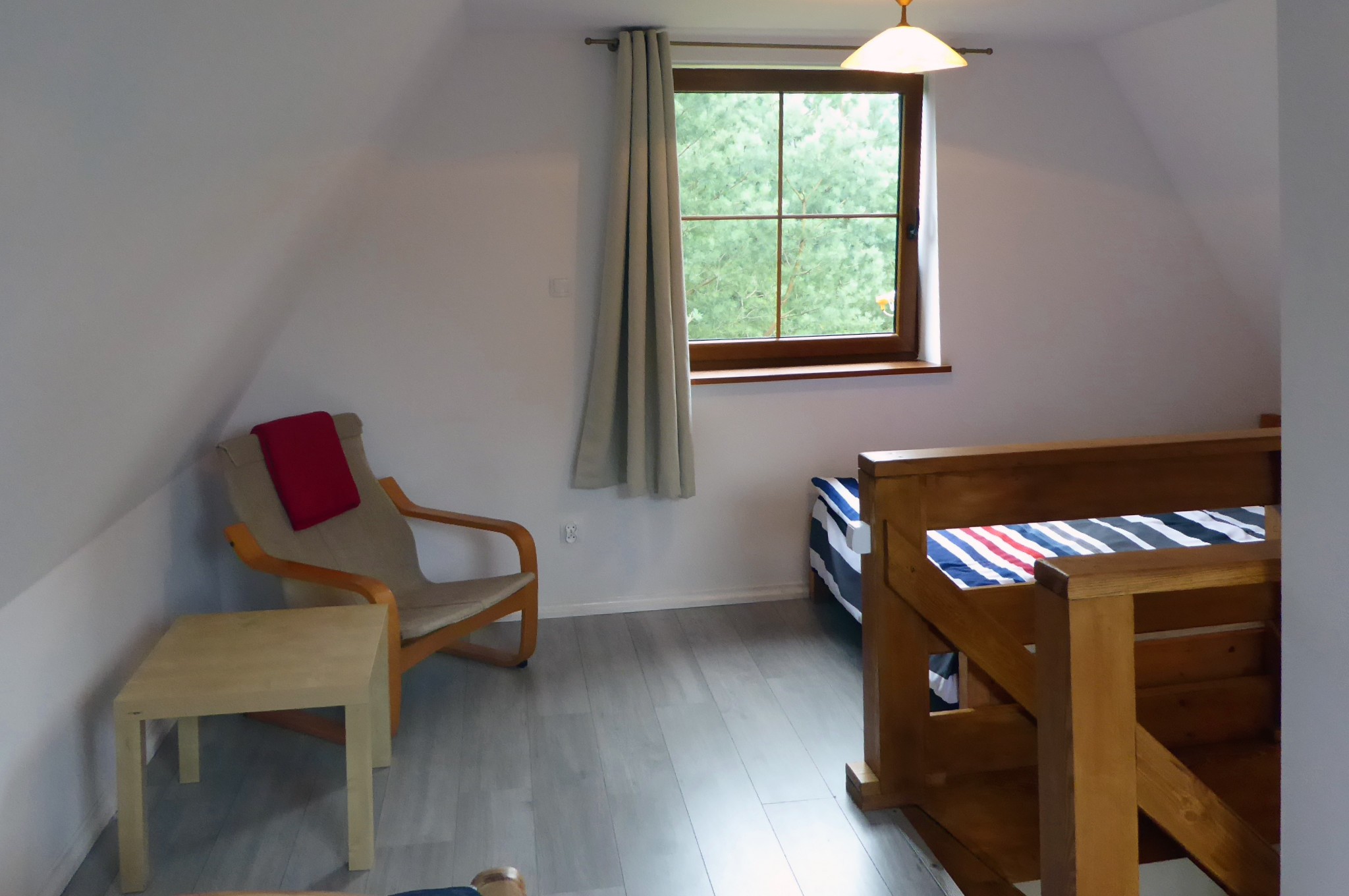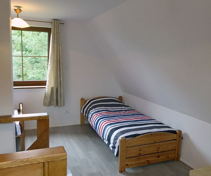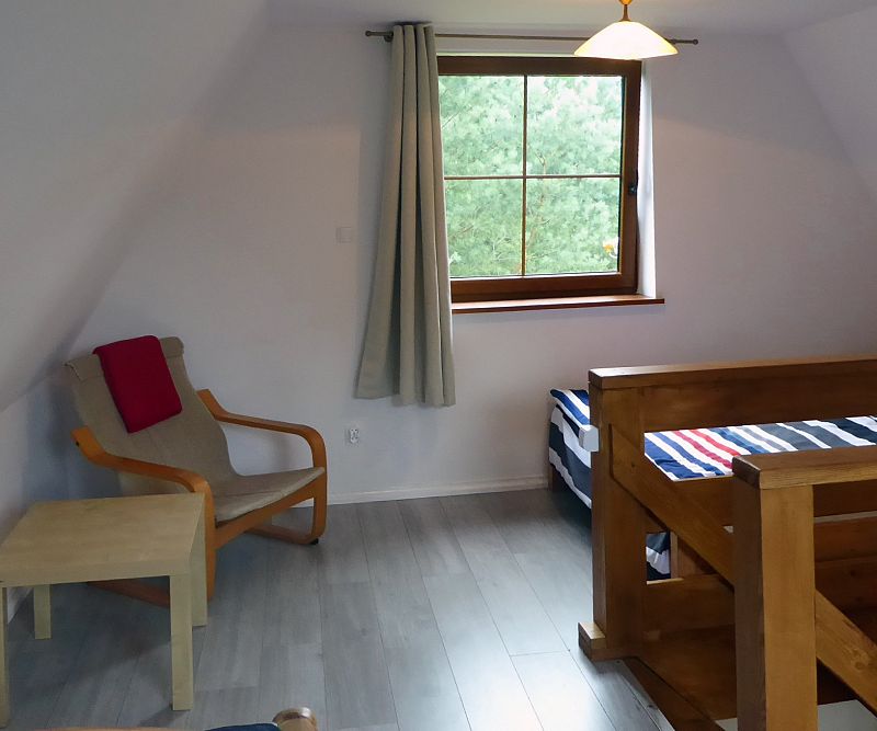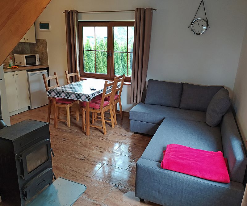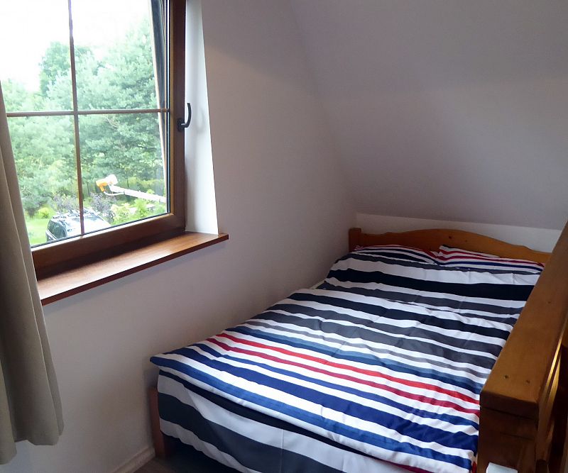 Domek nr 2 - 6 os. z przestronną sypialnią na piętrze mieszczącą łóżko małżeńskie oraz dwa pojedyncze łóżka. Na dole łazienka, salon, TV, rozkładana kanapa, kuchnia. Domek dysponuje tarasem ze sprzętem grillowym, otoczony jest przestronnym zielonym ogrodem.