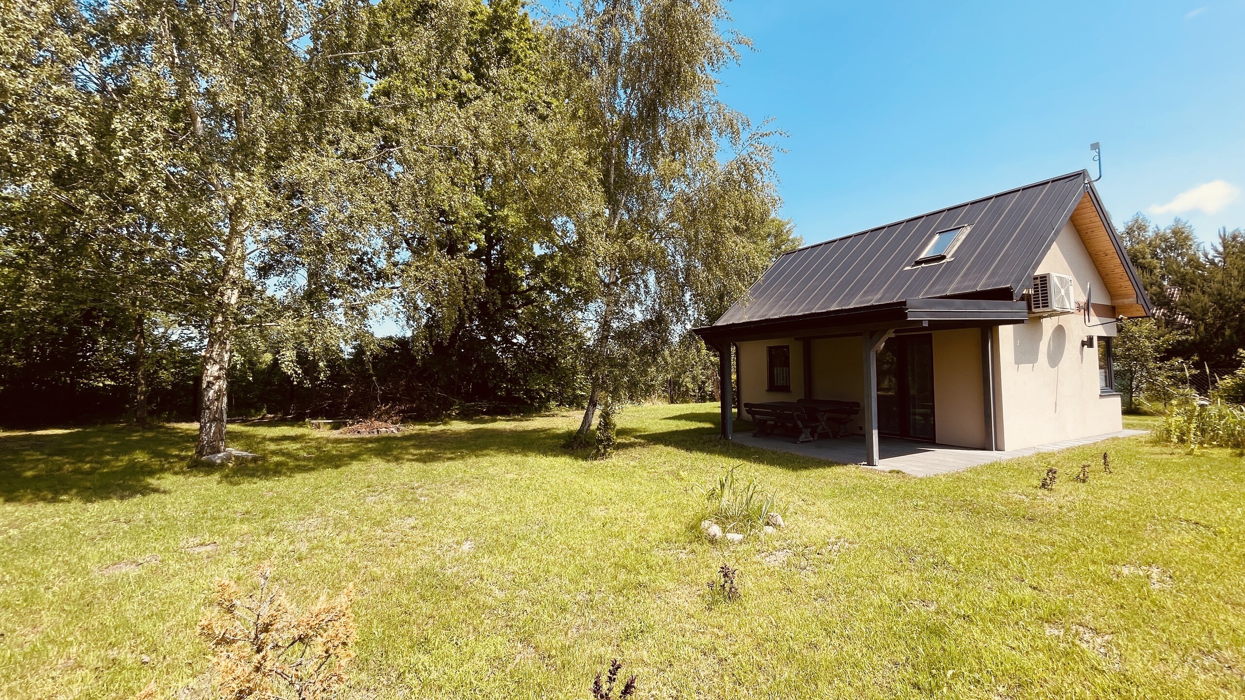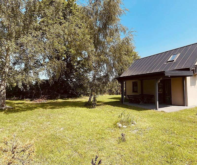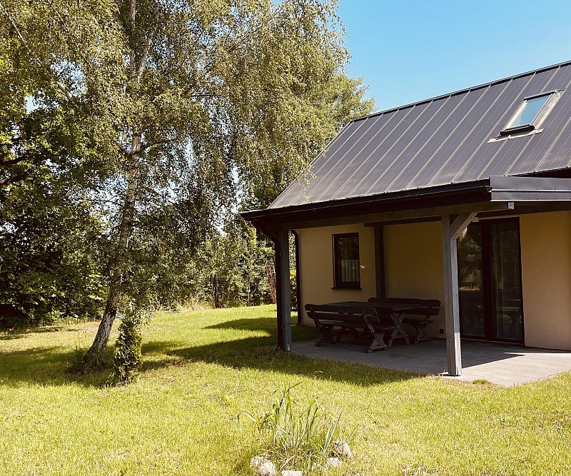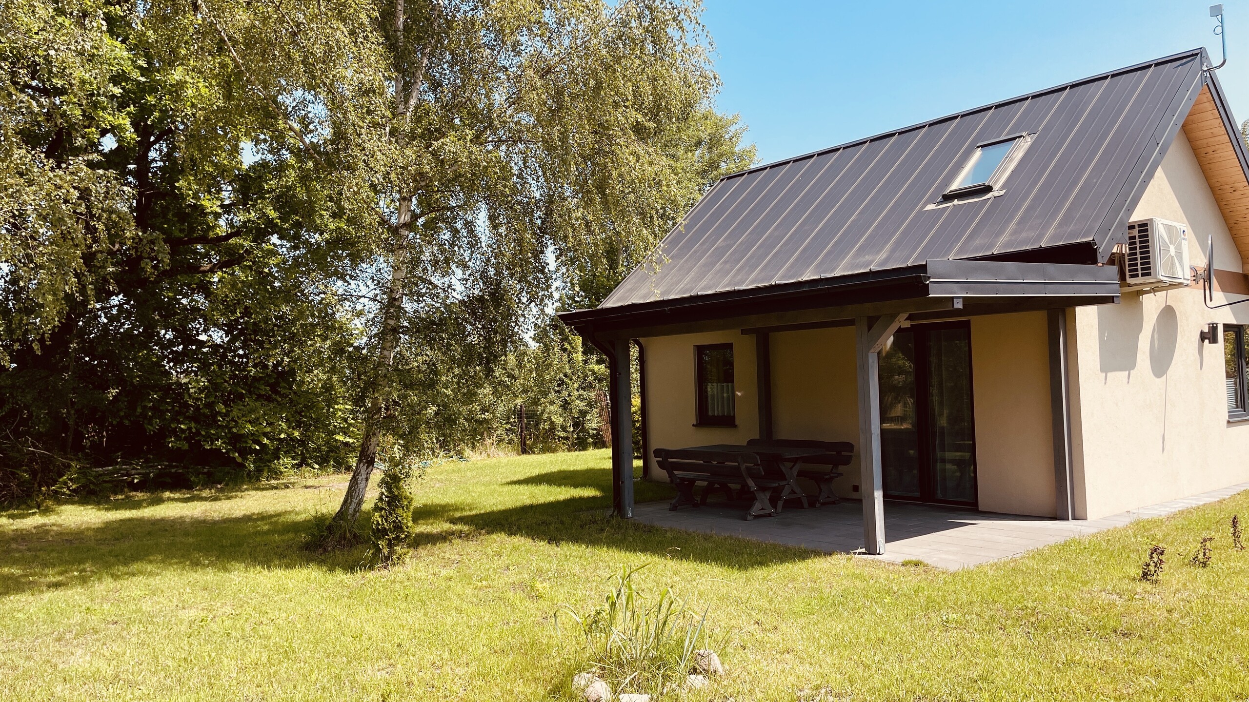 Domek posiada duży taras, sprzęt do grillowania, otoczony jest zielonym ogrodem.