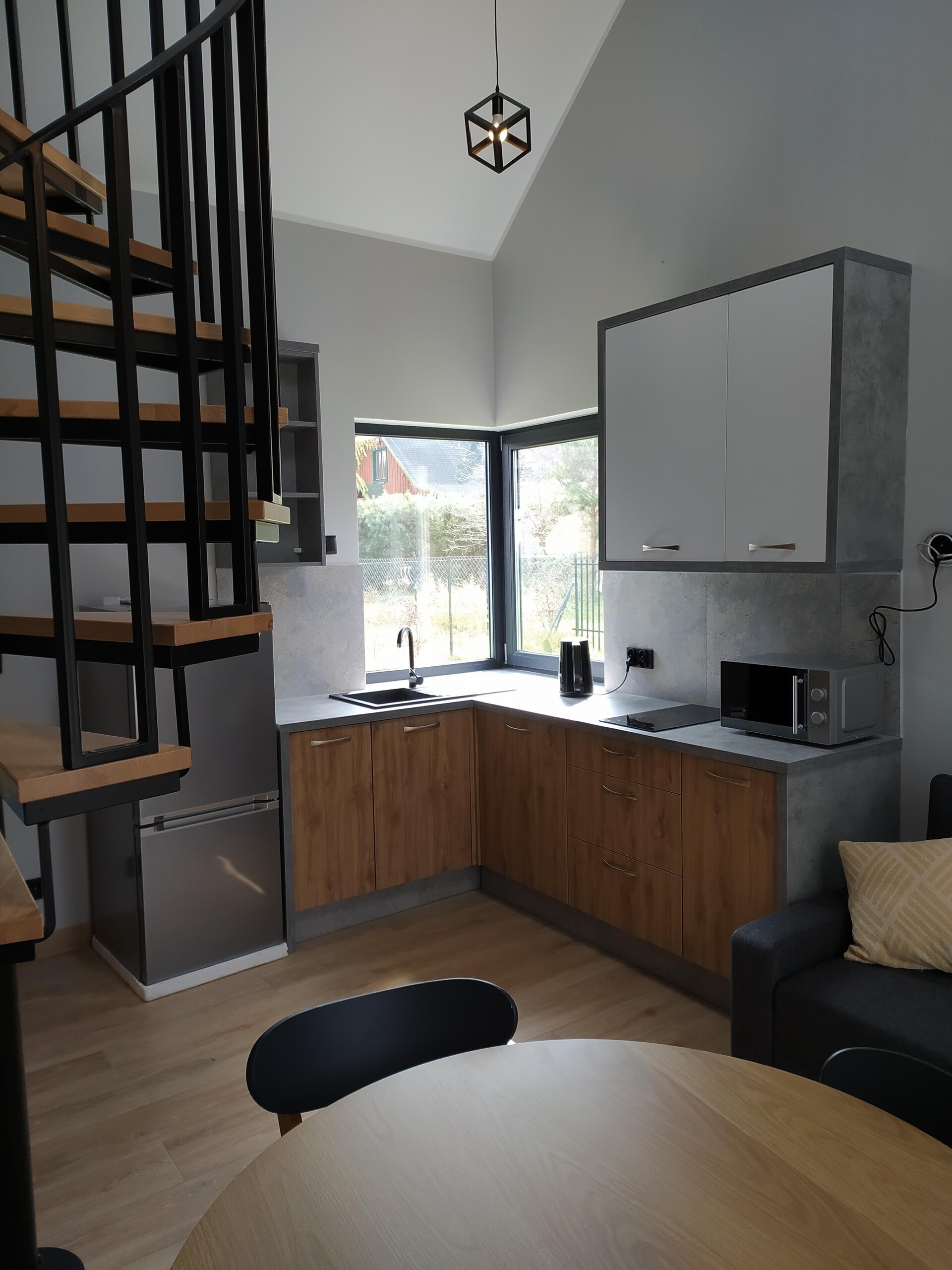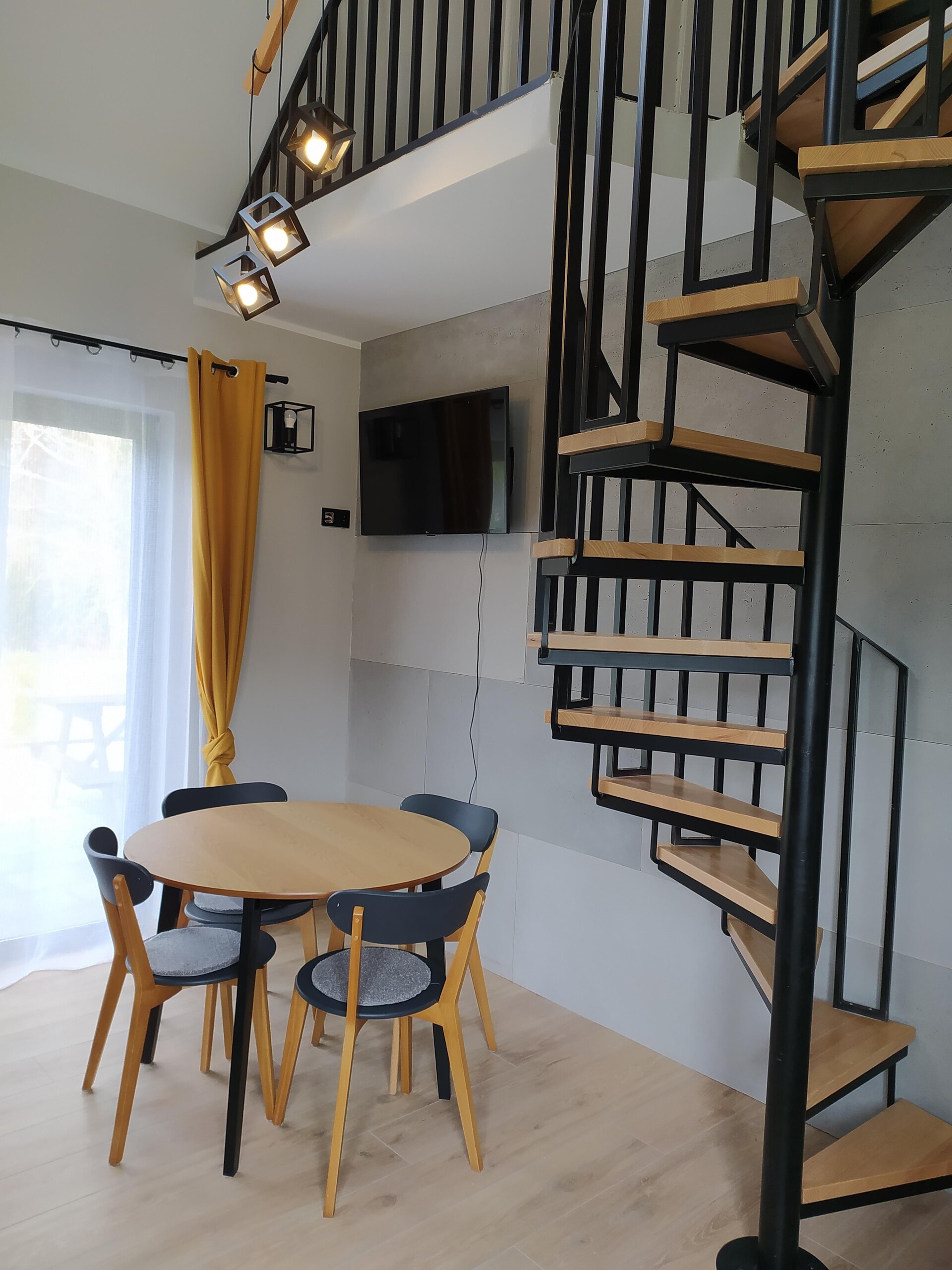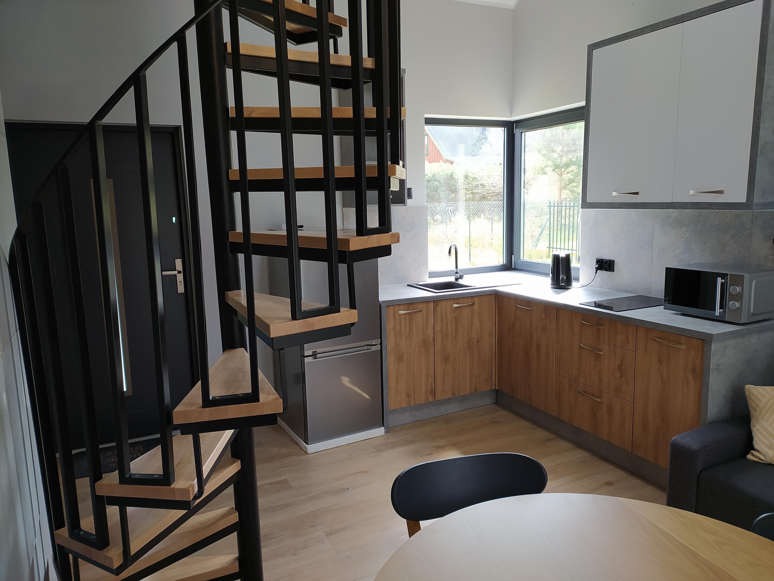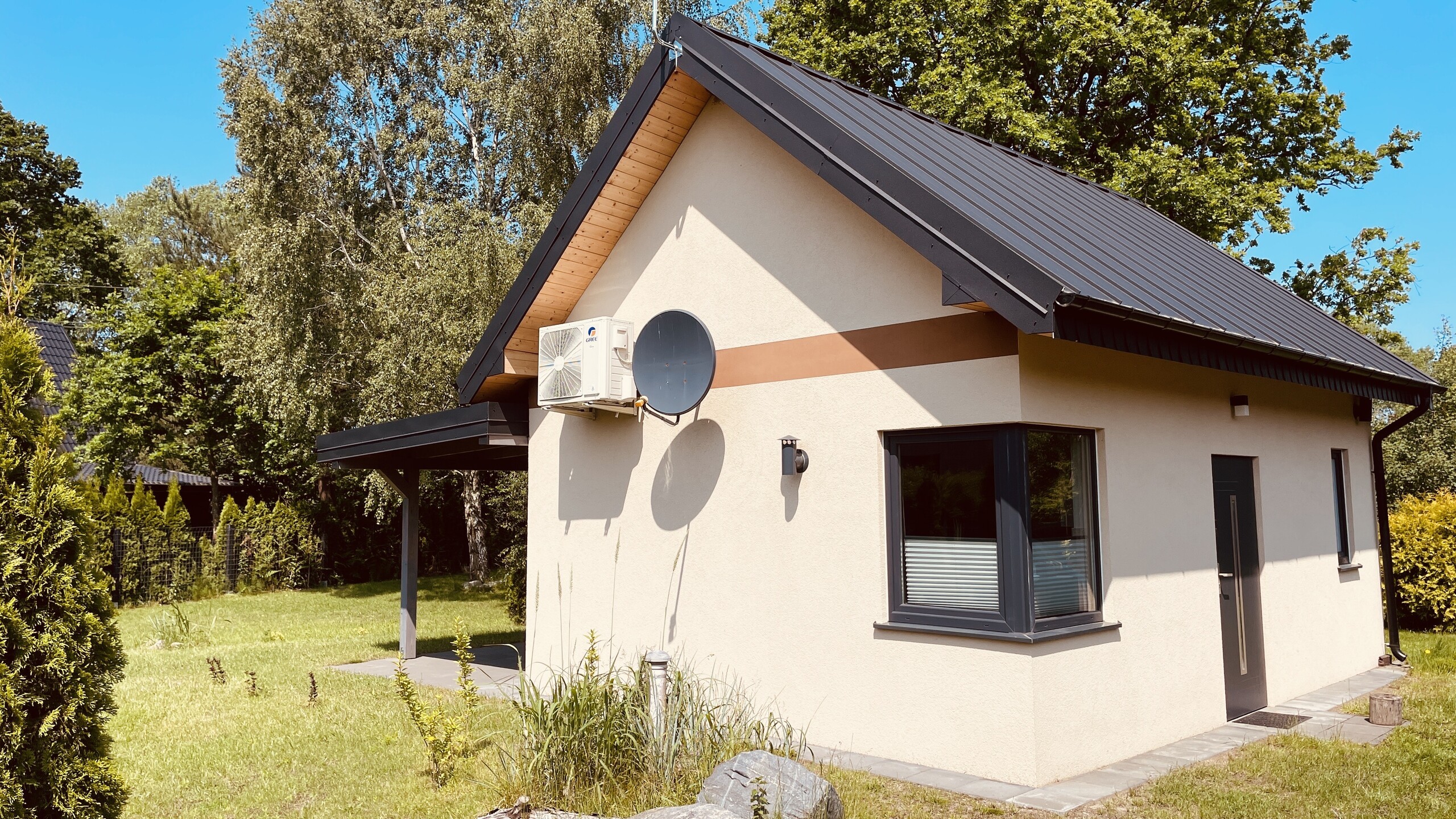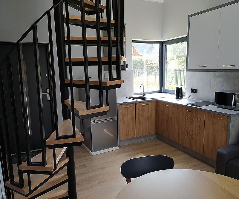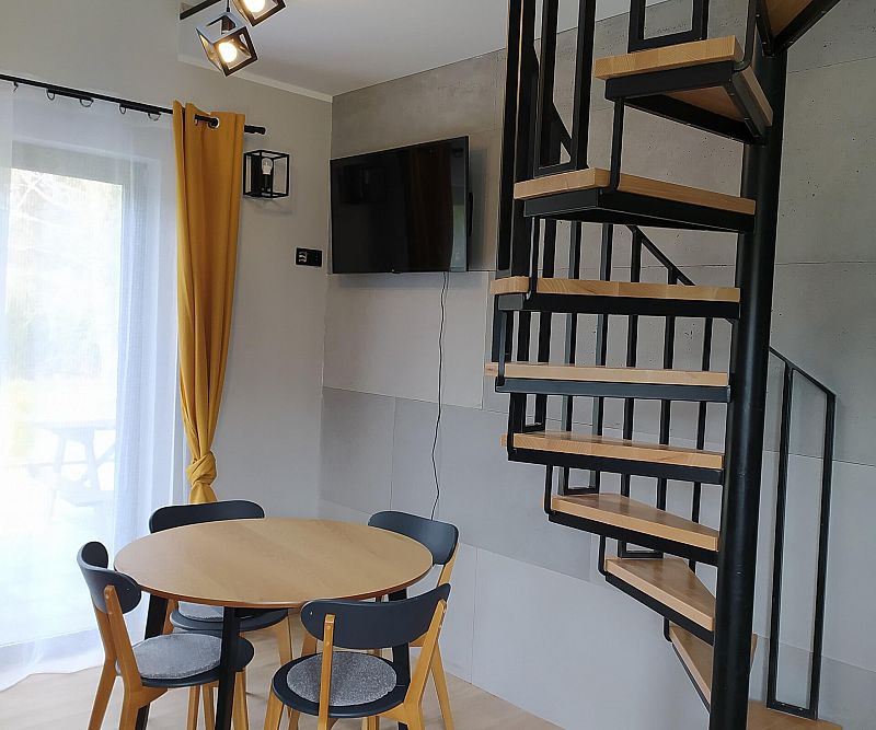 Domek ogrzewany za pomocą klimatyzacji, na dole jest osobna sypialnia, kuchnia z jadalnią, łazienka, na górze antresola z dwoma łóżkami.
