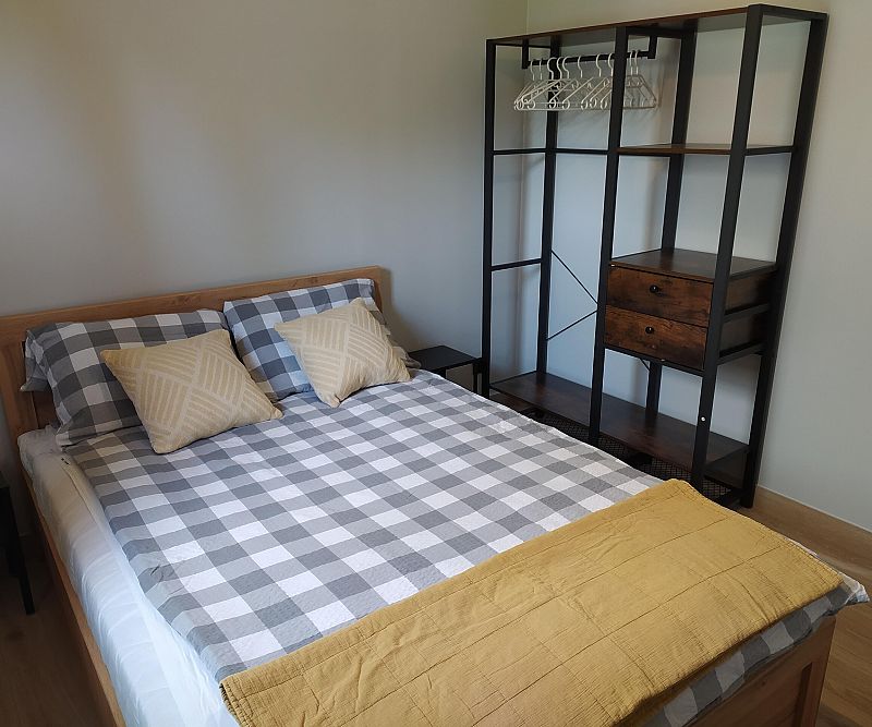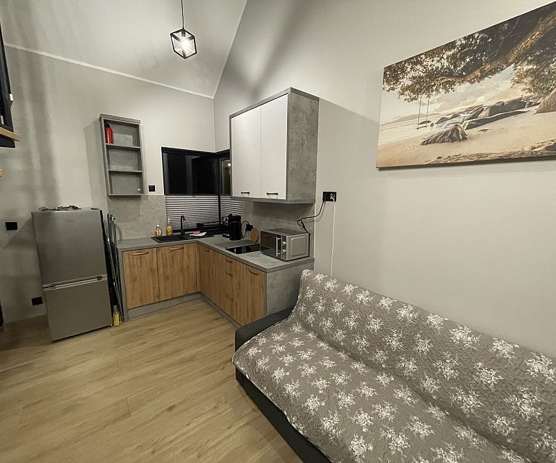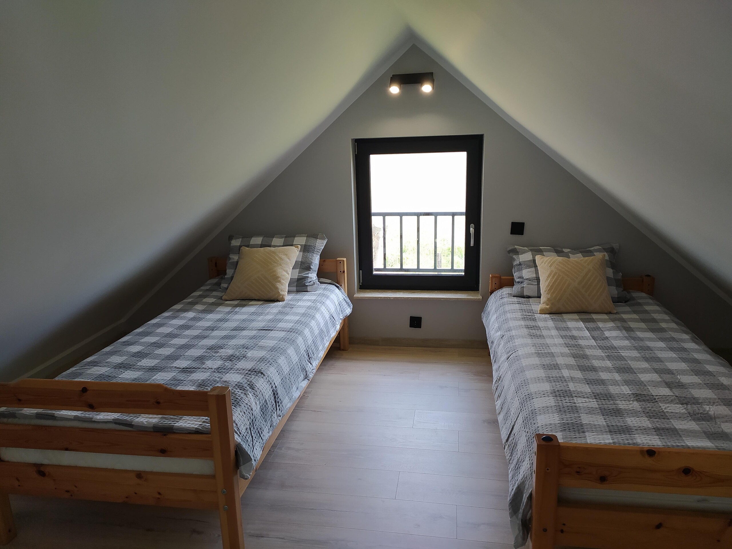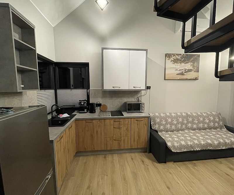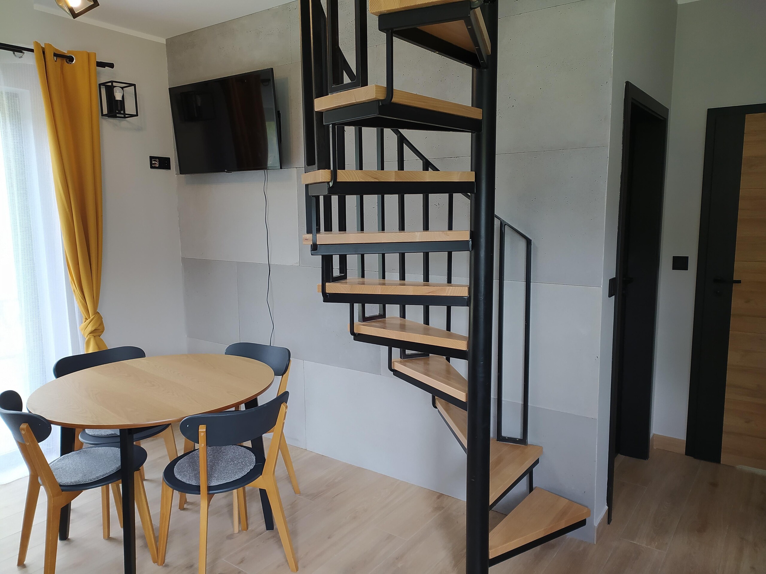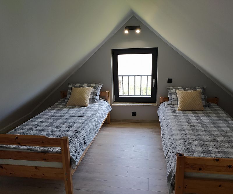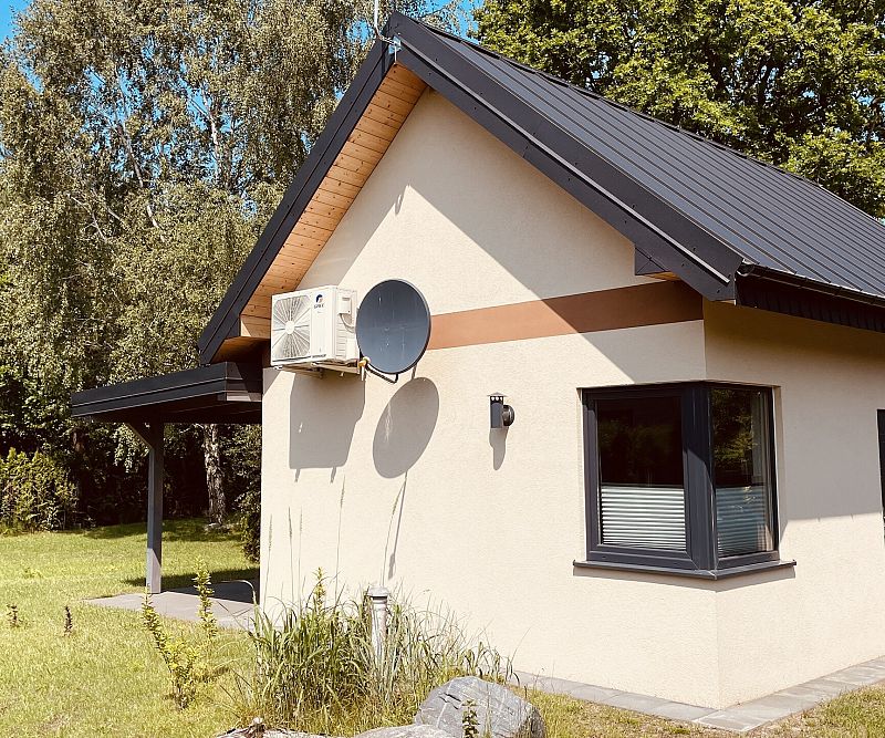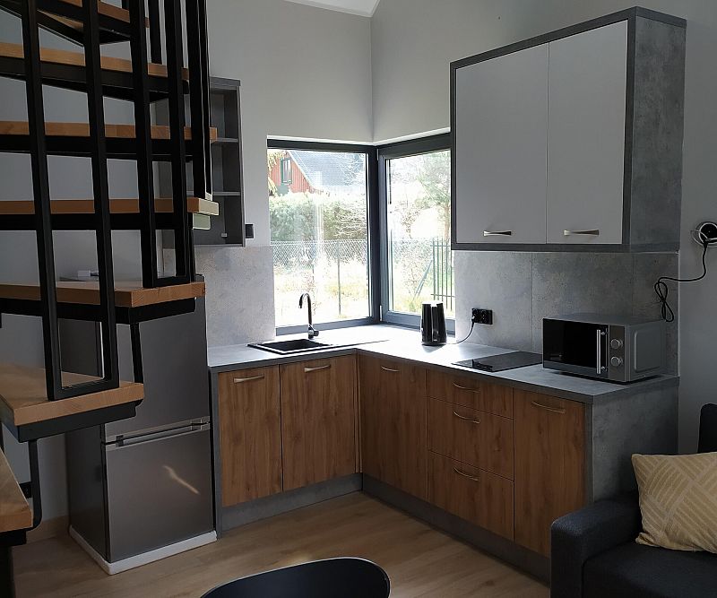 Domek ogrzewany za pomocą klimatyzacji, na dole jest osobna sypialnia, kuchnia z jadalnią, łazienka, na górze antresola z dwoma łóżkami.