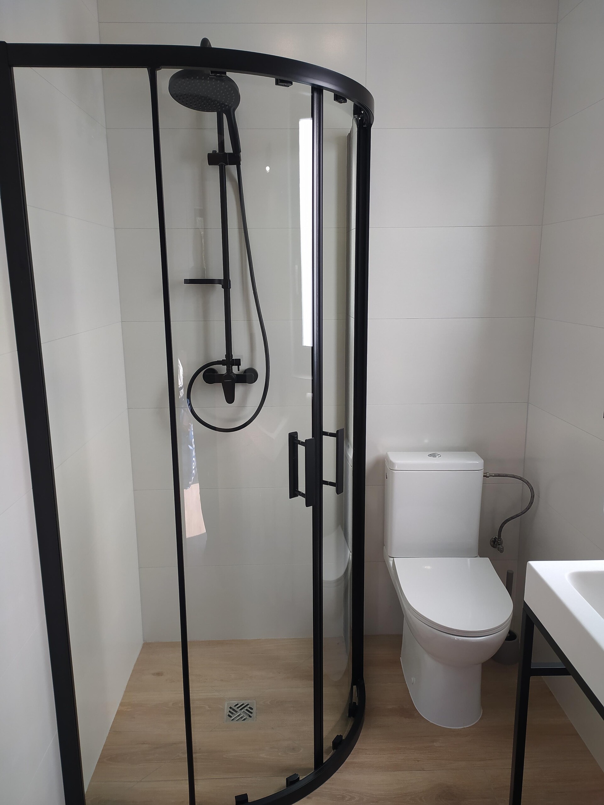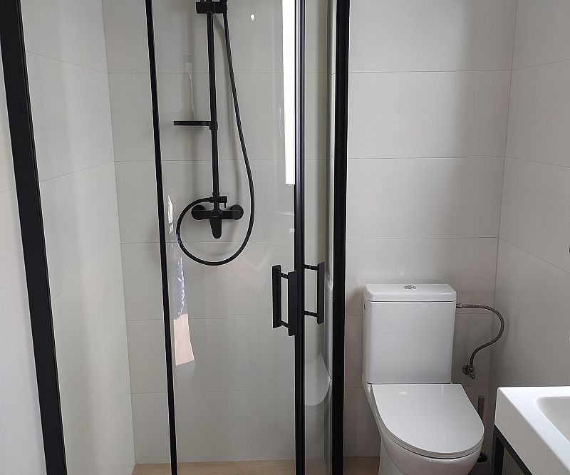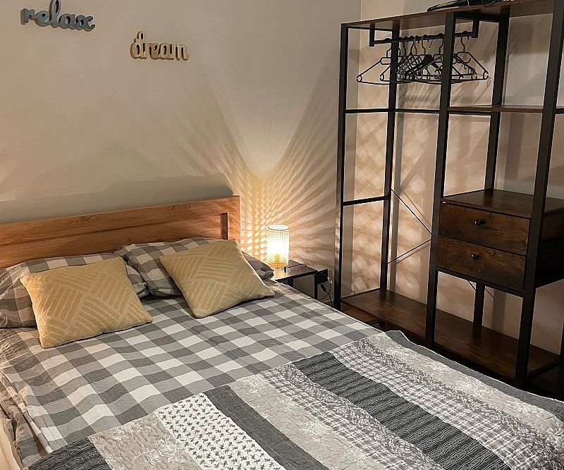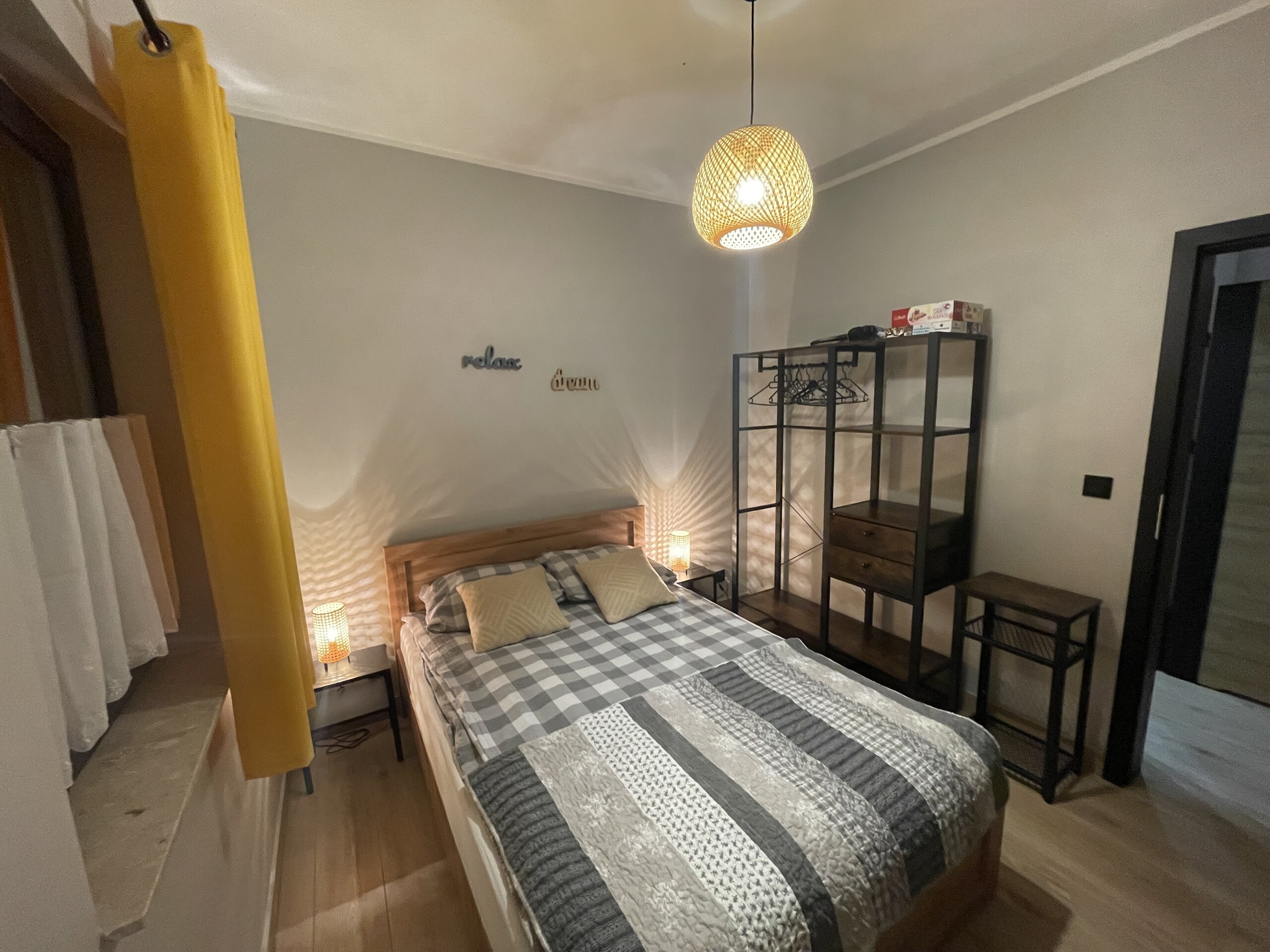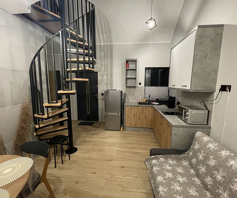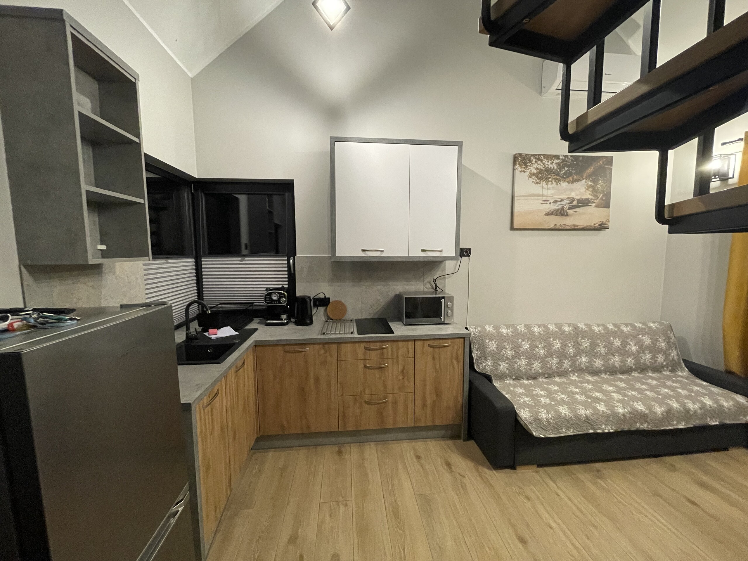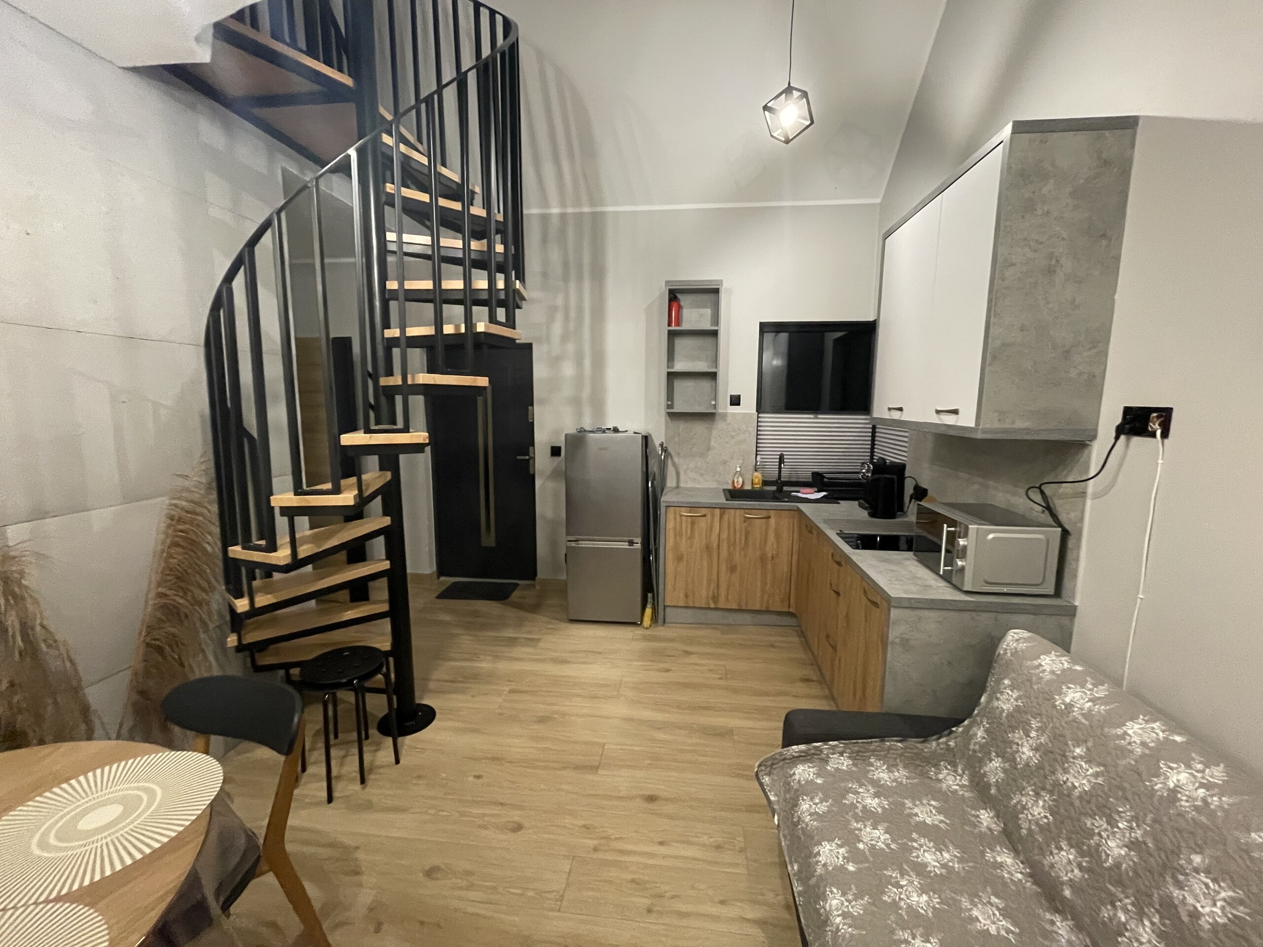 Domek ogrzewany za pomocą klimatyzacji, na dole jest osobna sypialnia, kuchnia z jadalnią, łazienka, na górze antresola z dwoma łóżkami.