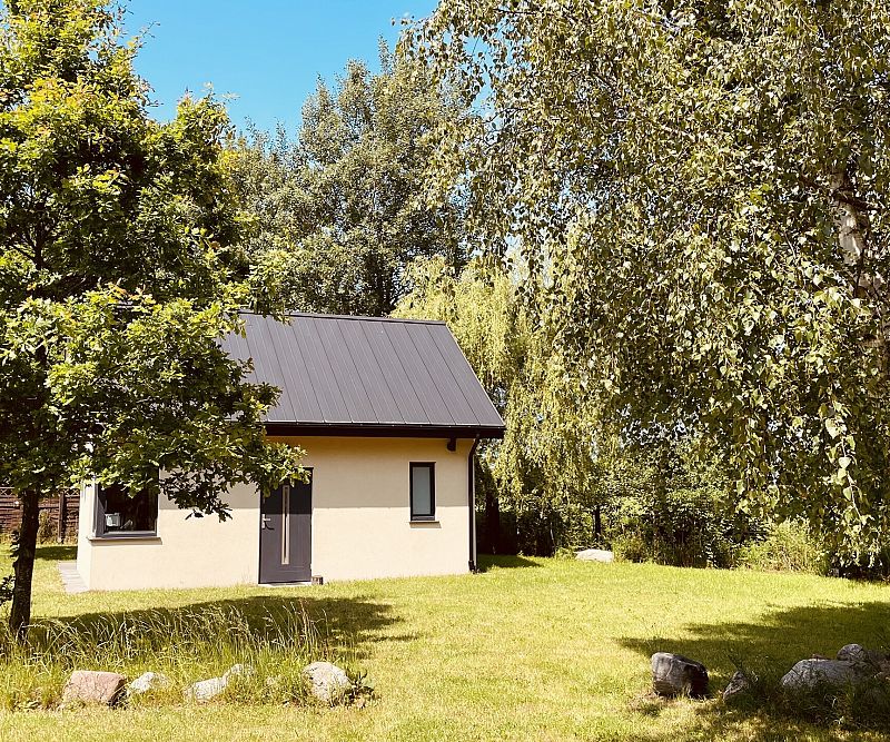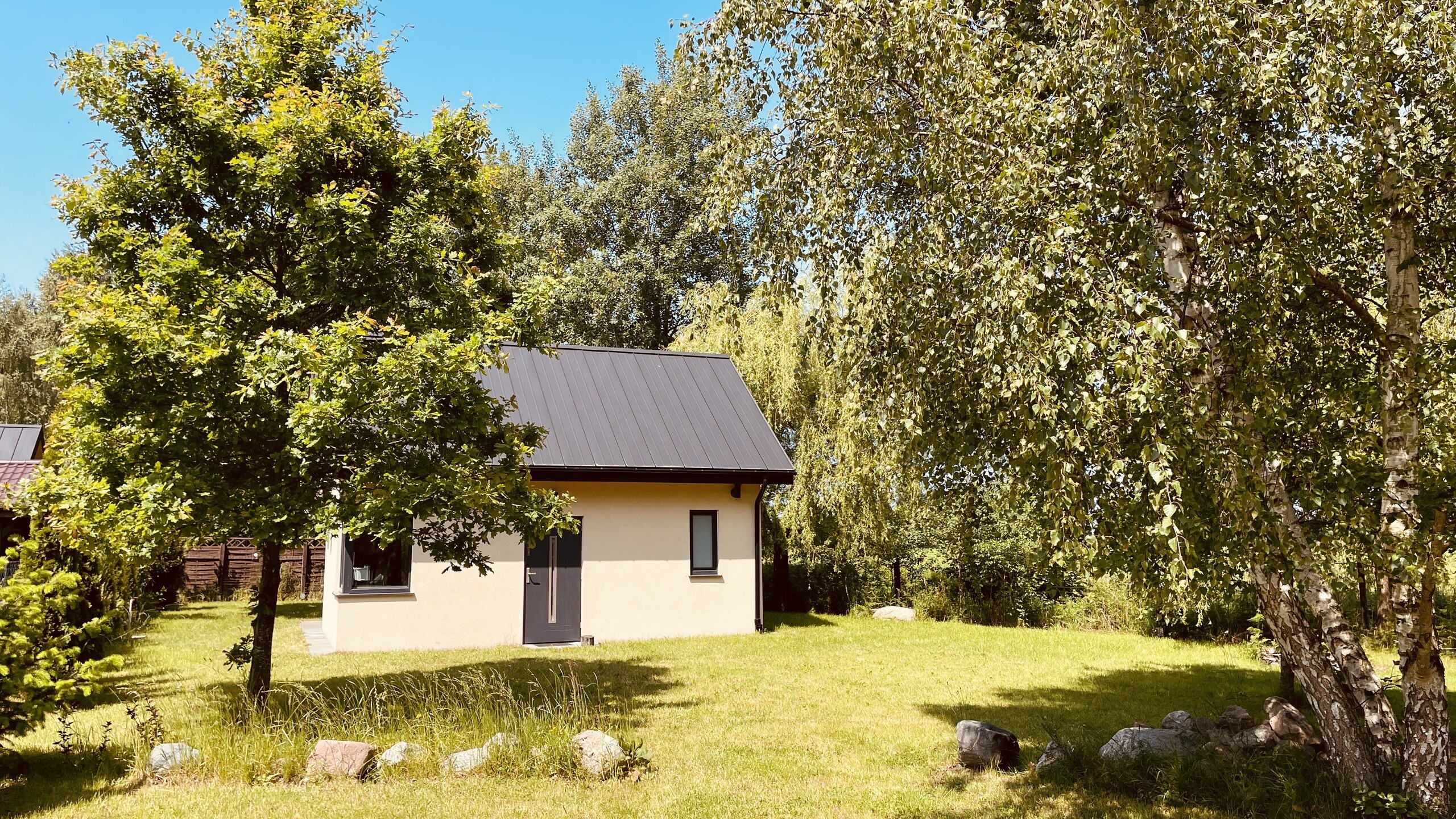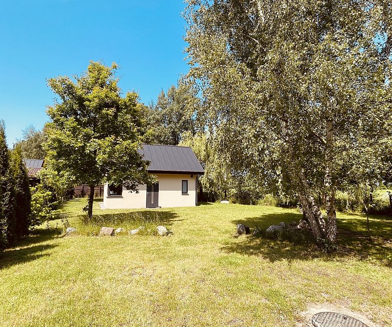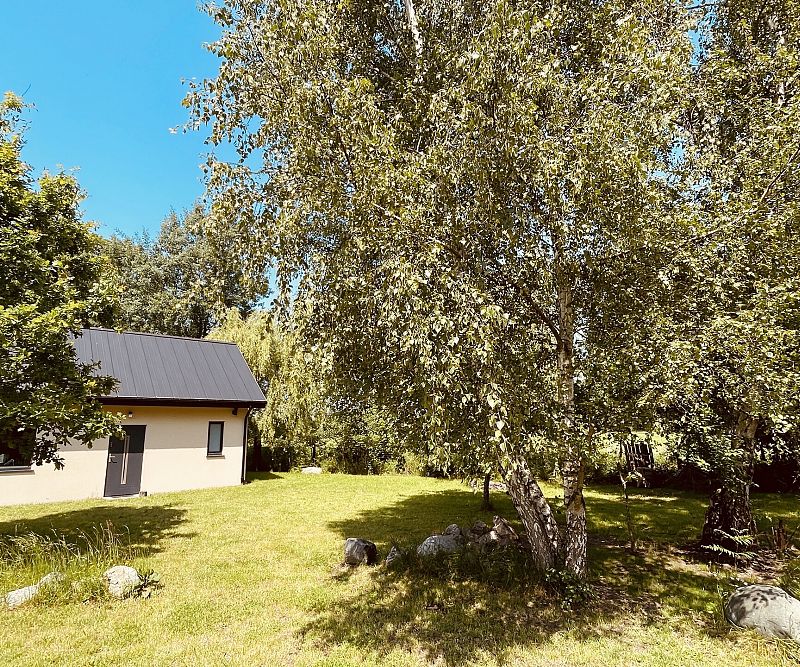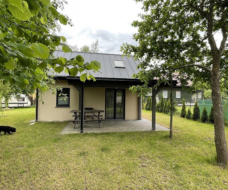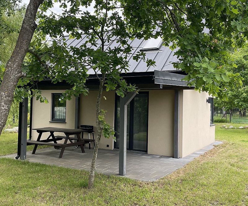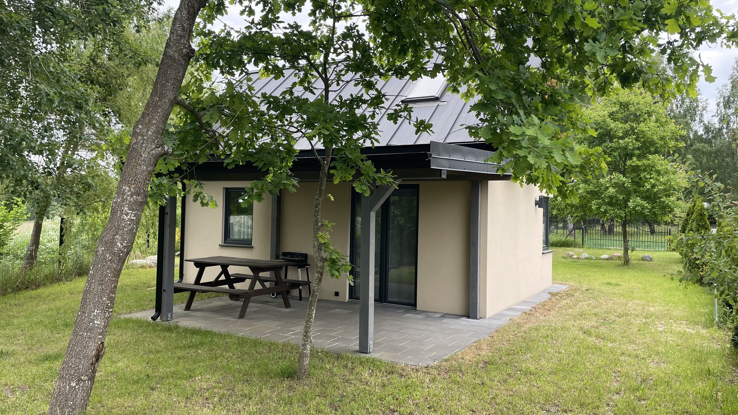 Domek posiada duży taras, sprzęt do grillowania, parawan, otoczony jest zielonym ogrodem.