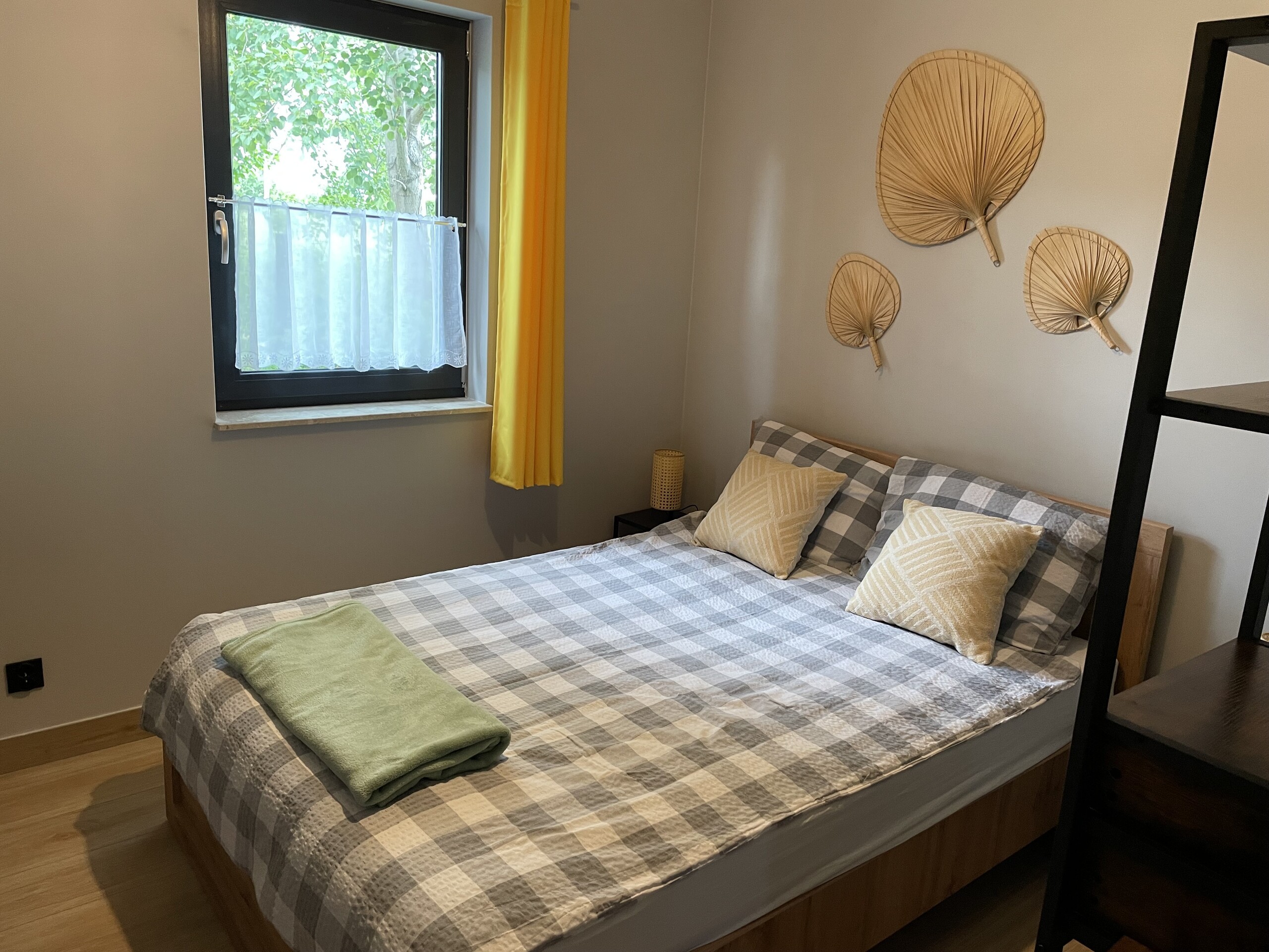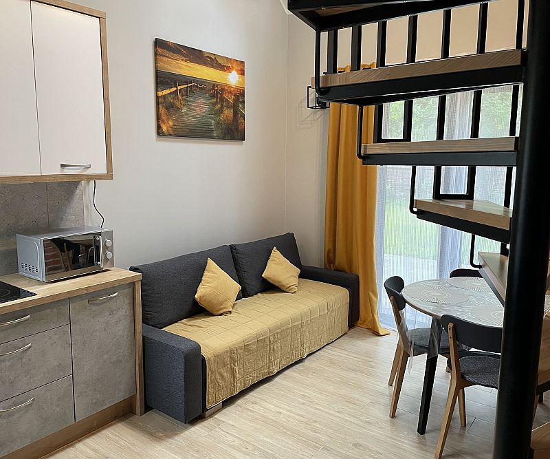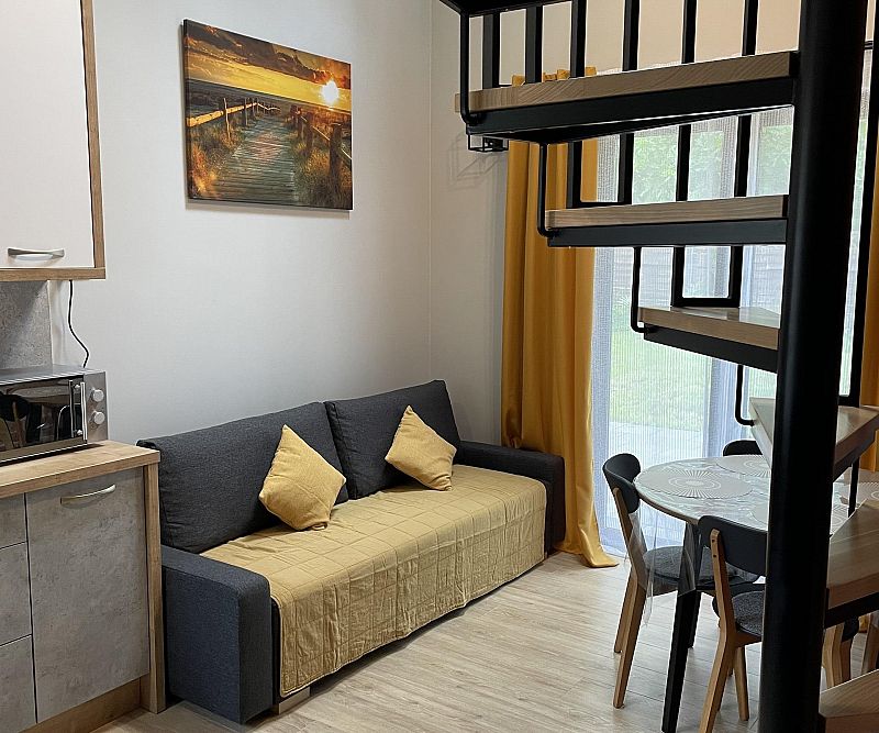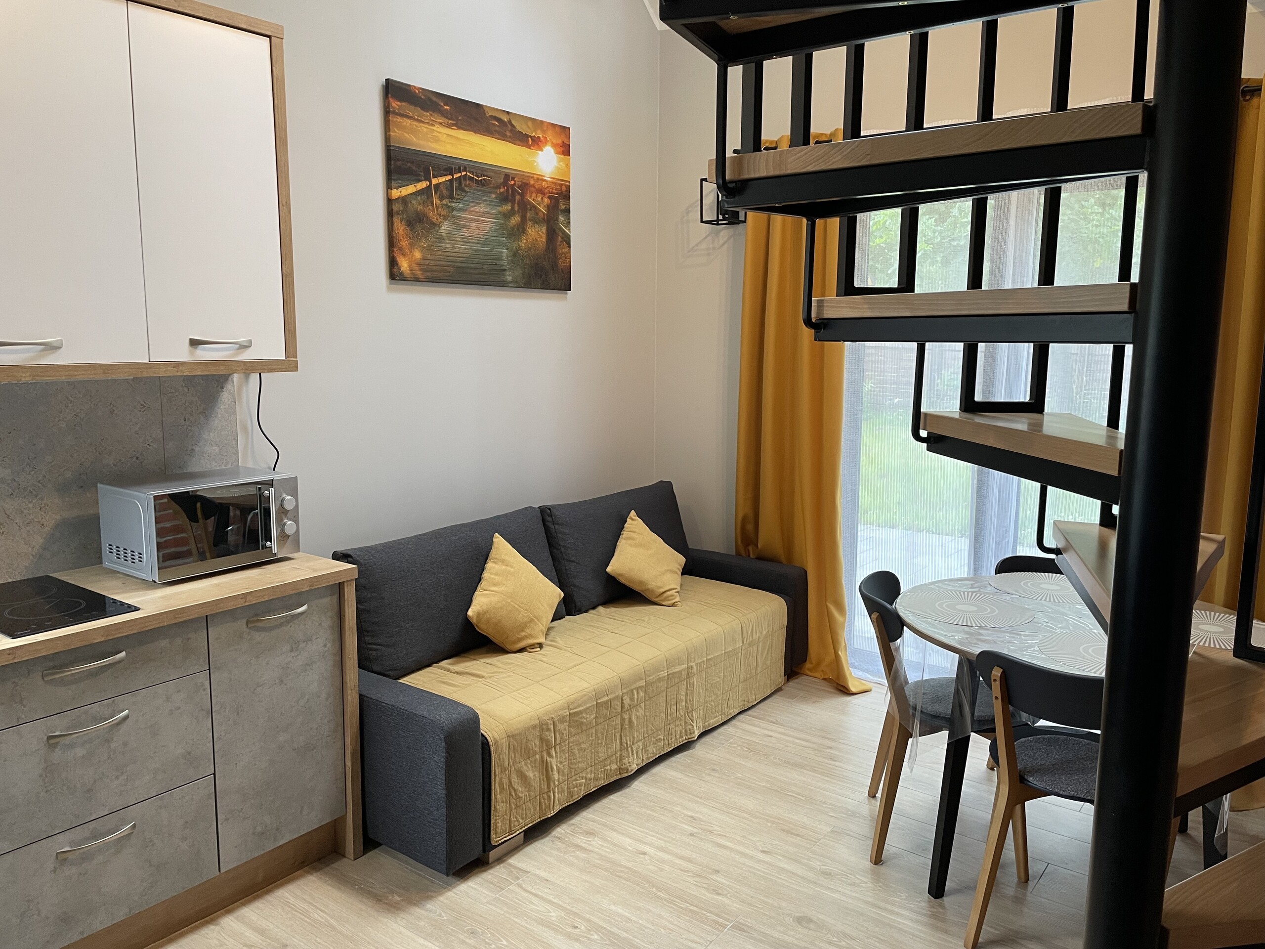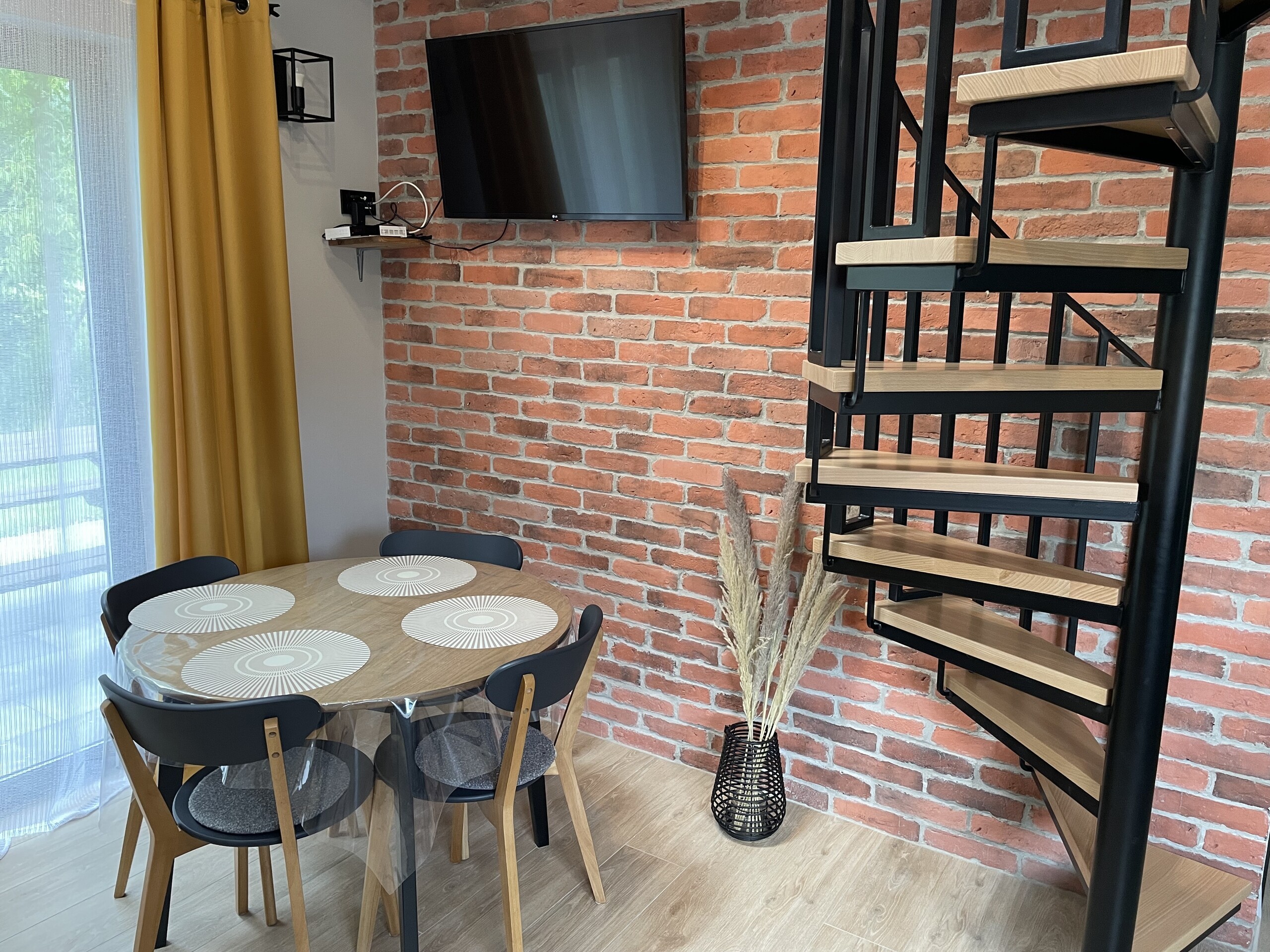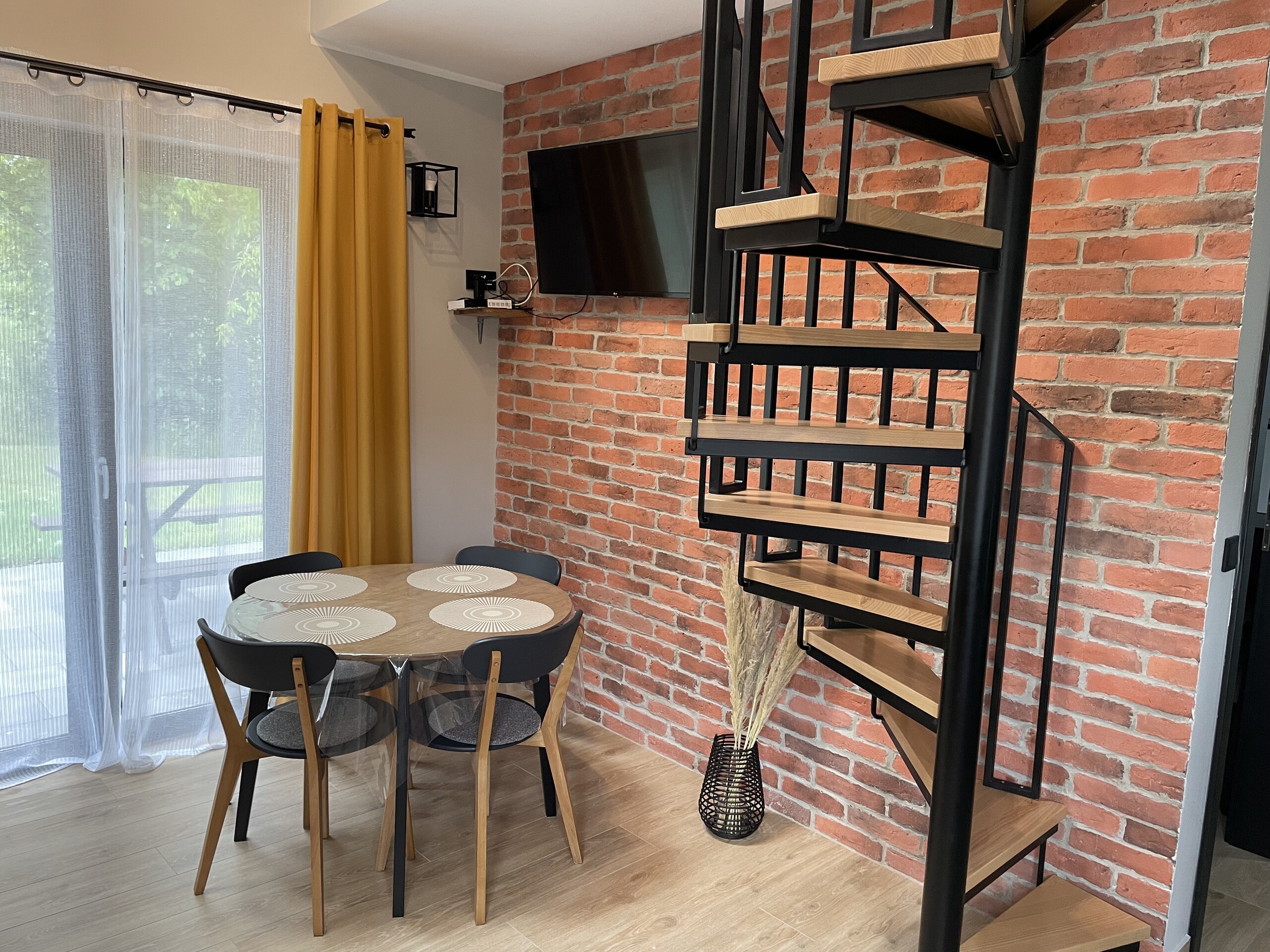 Domek ogrzewany za pomocą klimatyzacji, na dole jest osobna sypialnia, kuchnia z jadalnią, łazienka, na górze antresola z dwoma łóżkami.
