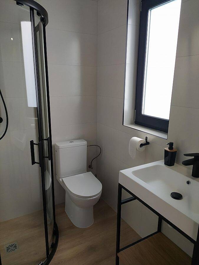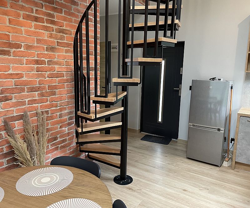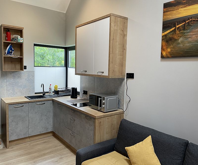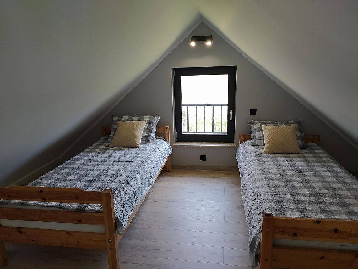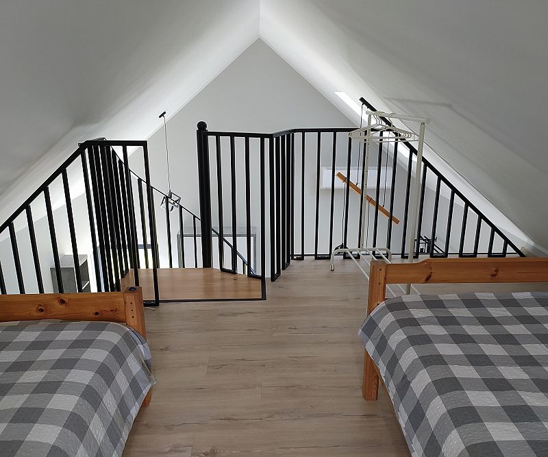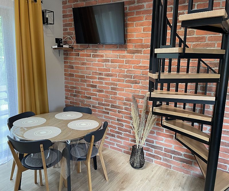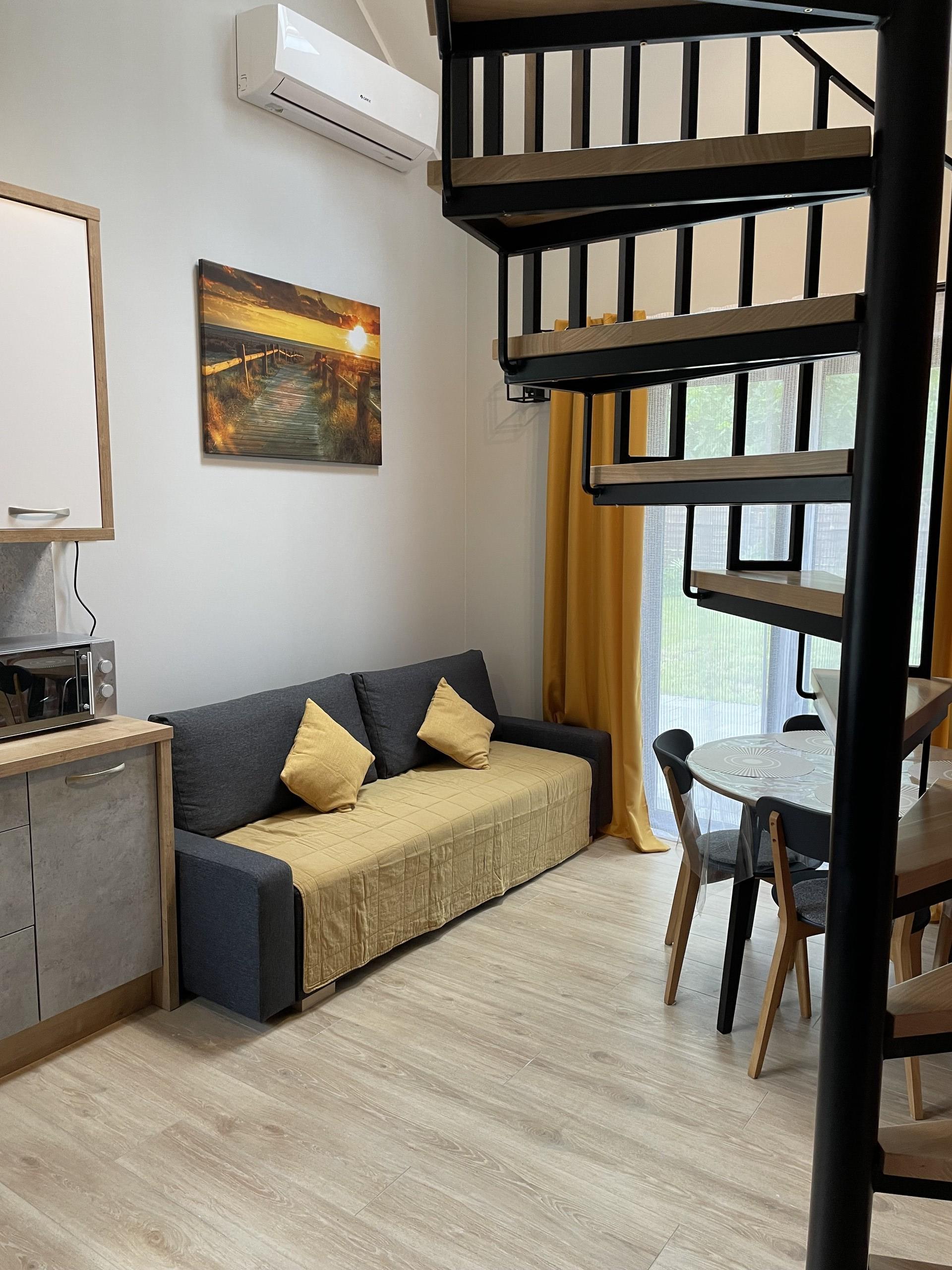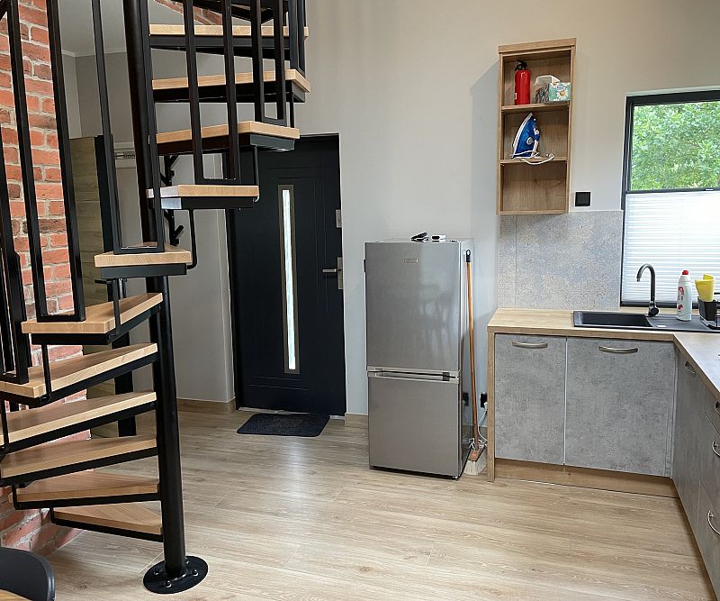 Domek ogrzewany za pomocą klimatyzacji, na dole jest osobna sypialnia, kuchnia z jadalnią, łazienka, na górze antresola z dwoma łóżkami.